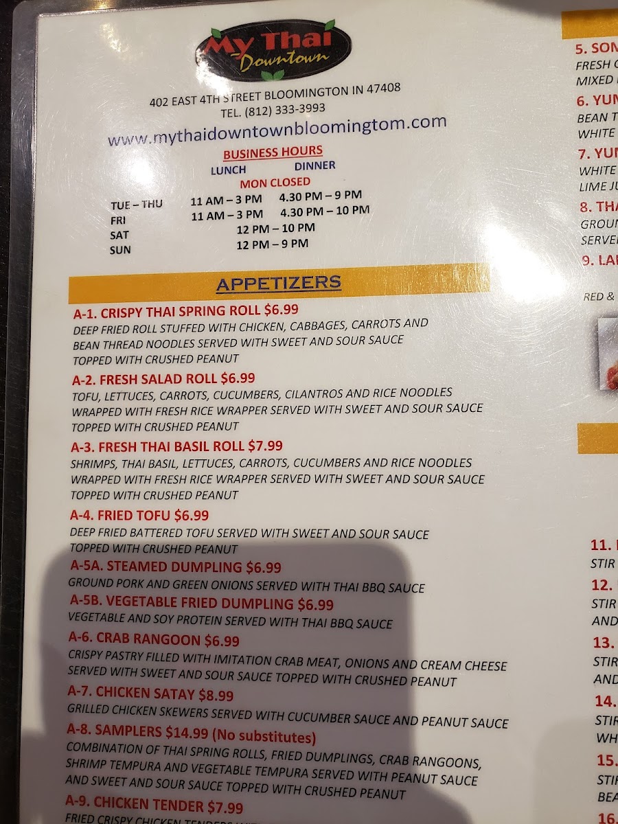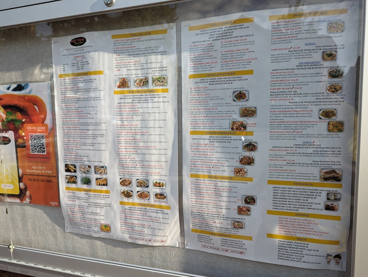 If you're looking for a flavorful adventure in the heart of Bloomington, My Thai Downtown Menu is a must-try. Located at 402 E 4th St, this cozy spot brings the bold and vibrant flavors of Thailand to the city, offering a variety of dishes that cater to every taste. From rich, aromatic curries to spicy stir-fries, each dish is carefully crafted with fresh ingredients and traditional spices. Whether you're a fan of seafood, chicken, or vegetarian options, there’s something for everyone.